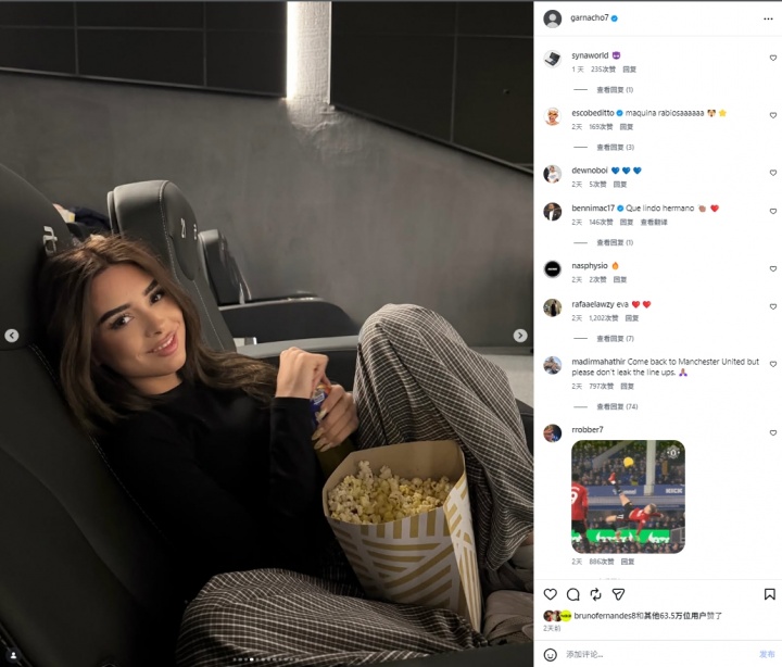 加纳乔在社媒的更新中晒出了一系列图片,包括比赛现场照片,在高级餐厅用餐等等片段。但最引人注目的是众多图片中的一张,一名棕发美女、西班牙网红洛巴兹在电影院吃爆米花的照片。